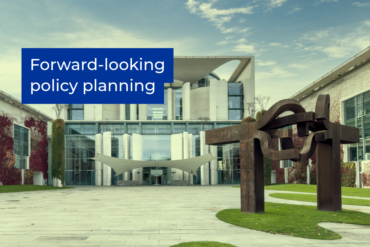 Government Foresight encompasses our collaboration with organizations that perform sovereign functions – from state governments and the German federal government to European and international organizations. We support government organizations in fulfilling their responsibility in a forward-looking and future-oriented manner. As many of our projects are classified, we can only present them in abstract form.