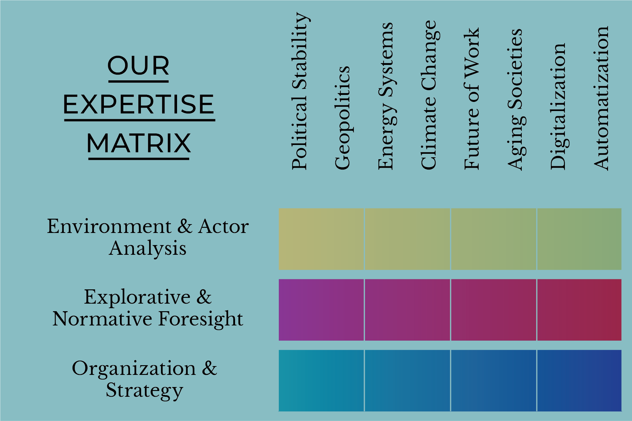 We are Foresight Intelligence experts and our work is centered around methodologies and concepts. However, we gained expertise in some issue areas that are inherently forward-looking (more precisely, we have expertise in the interfaces of these areas). Our competence matrix gives an overview of what we normally do.
